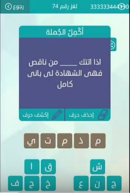جواب سؤال اذا اتتك من ناقص فهى الشهادة لى بانى كامل لغز رقم 74 من لعبة وصلة للمجموعة التاسعة صقور الإبدآع